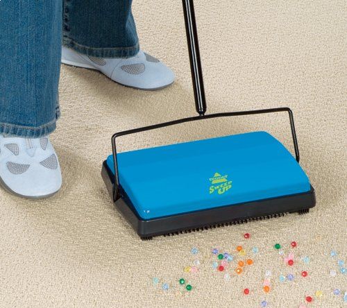 Bissell Sweep-up Manual Sweeper is always ready to go. No cord, no broom, or even a dust pan to deal with and no refill cartridges needed. Easy-to-empty, large capacity dirt pan with no replacement pads. Convenient low profile handle lies flat under furniture. Quick pick-ups for all floor surfaces. Great for wood, tile, carpet, vinyl, and laminate floors. Powerful cleaning, Dirtlifter brush system picks up dirt, crumbs, pet hair, and more. Nonslip handle, brush comb, twin dirt pans, and 4 edge cleaning brushes.