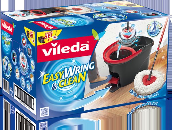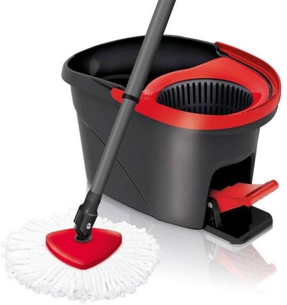 The premium Vileda EasyWring & Clean Spin Mop set is a combination of a microfibre mop and a bucket with a foot pedal operated wringer, used for effortless wringing and quicker floor cleaning.