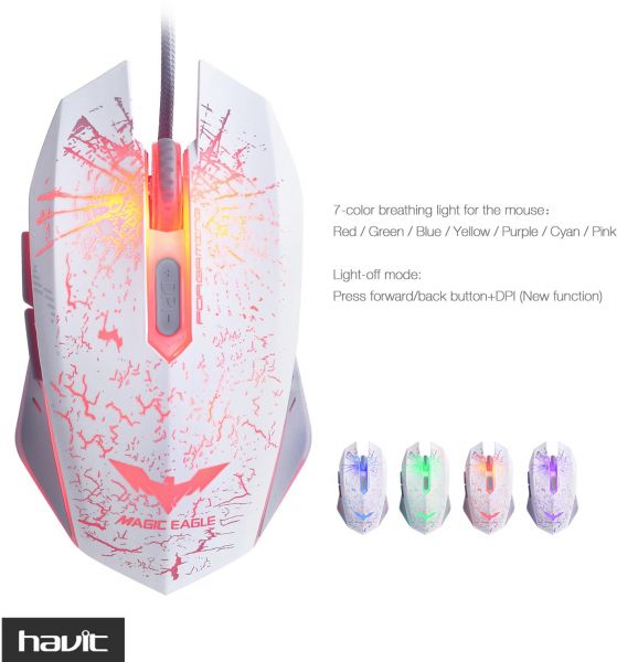 • 4 color breathing light of mouse :Red, Blue, Purple, Pink; Light-off mode: forward/back button+DPI- Brand : Havit
