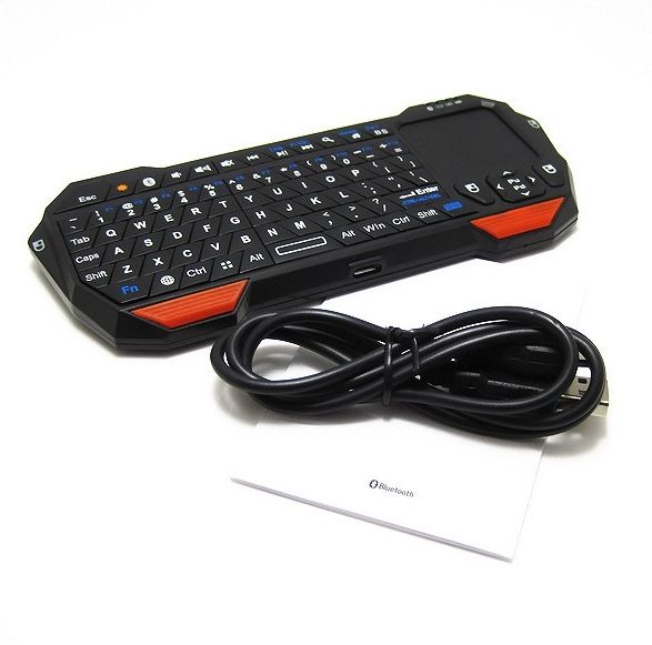 Features:Backlit for operation in dark room.Real touchpad: ultra sensitive and multi-touch.3 in 1 function: keyboard, mouse and touchpad.Short charge time: about 2 hours can fully charge the battery.Unique page up and page down key for convenient presentation.Built-in re-chargeable Lithium-ion battery which supports long time working.Bluetooth connection makes you enjoy wide range wireless control.The LED indicators are designed for signal of pairing status, battery indicator, capslock status, etc.Switch keyboard software systemfor iOS system:FN+Qfor Windows system:FN+Wfor Android system:FN+ESpecifications:Weight:Approx. 100gKeyboard weight:Approx. 75gMaterial:Engineering plasticPortable size:57*150*12.5mmStyle:Standard,slim,multimedia,miniType:Bluetooth wirelessBluetooth version:V3.0Working distance:<10MBattery capacity:250mACharging time:2-2.5 hoursPackage Includes:1 * Bluetooth Keyboard1 * USB Charging Cable1 * User Manual