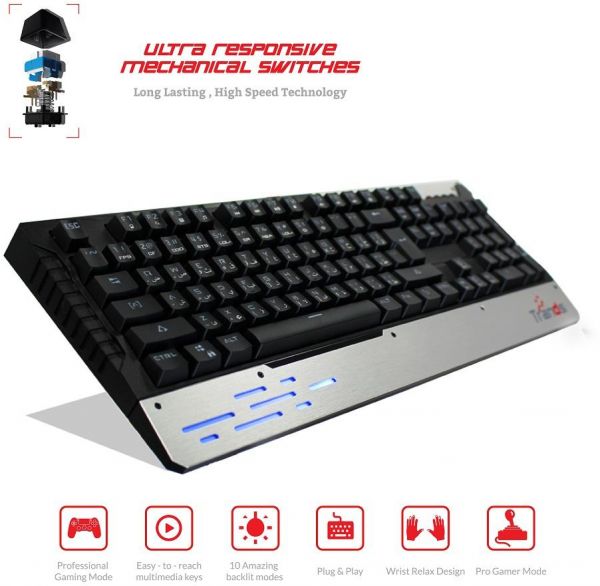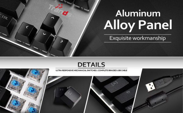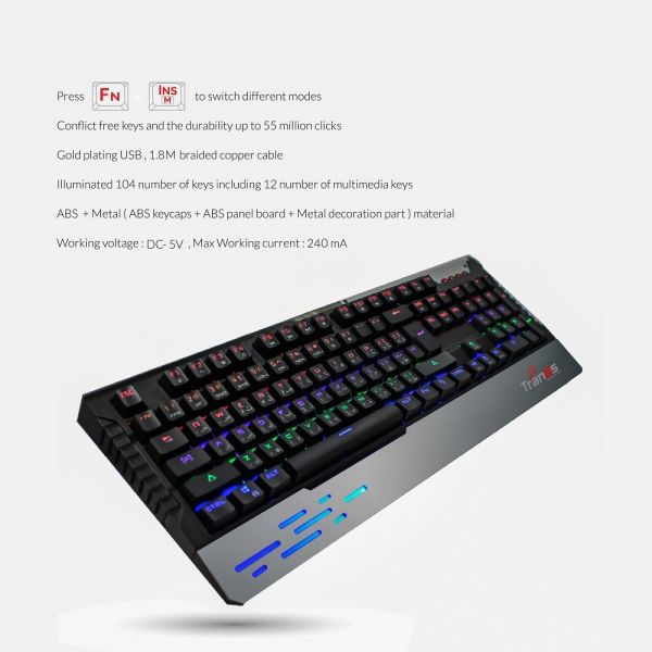 SPECIFICATION: Model Number: KB2392 Brand: Trands Connectivity: USB Compatible with: PC & Laptop Colour: Black Keyboard Language: English & Arabic Batteries Included: No LED full off. Brand : Trands Color : Black Keyboard Language : English & Arabic Batteries Included? : No Connectivity : USB Compatible with : PC & Laptop Model Number : TR-KB2391V2 FEATURES: Colourful Lighting: Compared with other competing products, this USB keyboard has a rainbow LED backlit, and it also has 9 kinds of different lighting mode make it looks like an RGB keyboard. You can try different lighting and choose the one you like best. Real Mechanical Keyboard: This pc gaming keyboard is a real mechanical keyboard with Anti ghosting, unlike other “Mechanical similar” or “Mechanical feeling” products. Once you have used it, you will like the sense of tapping and the unique crisp click sound of the blue switch. Compact 87 Keys Keyboard: The ten keyless keyboard design not only saves your tight desktop space but also makes your keyboard and mouse to become closer, so you can maximize the comfort and accuracy of your operation. Materials and Workmanship: The top shell is sandblasted aluminium coating braided USB cable. The unique double shot ABS keycap, this makes the keyboard greater durability. The bottom of the keyboard has 2 rubber feet and 2 flips up feet make the keyboard more stable while gaming. Easy access multimedia controls: Efficiently adjust volume, easy access to email, calculation, my computer or internet. LIGHT MODES: LED full on mode. Pulsating mode. Single key on when pressed. Vertical spreading mode. Flowing mode. Snake marquee mode. Corner marquee mode. Line marquee mode. Line spreading mode.