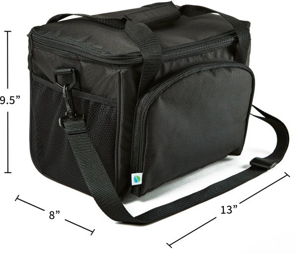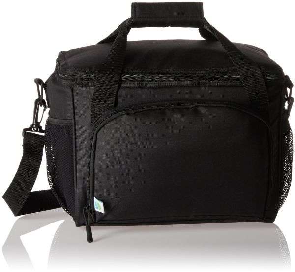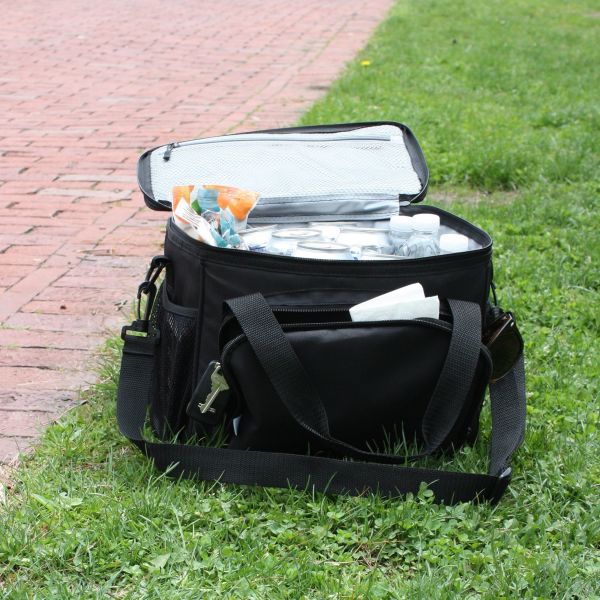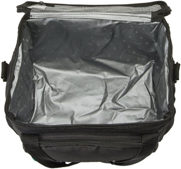 The Fit & Fresh Insulated Cooler Bag is designed with extra- thick insulation; allowing you to enjoy healthy and fresh meals long after you've left home. Perfect for the office, job site and school. The adjustable strap allows the cooler to be carried comfortably in a variety of ways. A spacious PEVA-lined interior leaves room to pack up to 12 cans or water bottles. An interior zippered mesh pocket can be used to hold an ice pack or two to help keep contents secure for longer. Two side mesh pockets are great for holding bottles and the front zippered pocket can help keep small valuables secure. Bag measures 9.5" tall x 13" wide x 8" long.