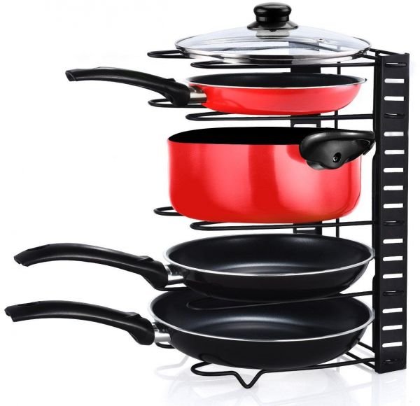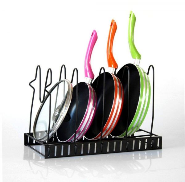 Pan organizer keeps your pans well organized without scuffing one another. The maximum spacing can reach up to 14.17” with 5 adjustable dividers; it fits all sizes cookware, such as frying pan, milk pot, stockpot, lid etc. (For small pans, we recommend horizontal installation)