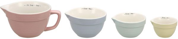 These batter bowl-shaped measuring cups provide form and function when baking! The retro pastel colors are sure to add a whimsical touch of color to your kitchen. The set includes 1 1/2 cup (12 oz), 1 cup (8oz), 1/2 cup (4 oz), 1/4 cup (2 oz). All cups are marked with both cups and ounce measurements. Cups nest together when not in use. Makes a great housewarming gift!