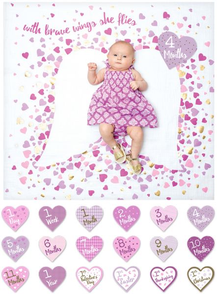 Includes: 1 muslin blanket + 7 double-sided cards with 14 milestones. Perfect for the modern day social mom. The muslin blanket and card combination makes the perfect prop for baby photos.