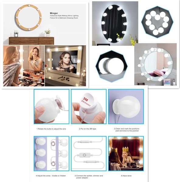 - Securely attach on a mirror, mirror frame or wall with the supplied double-sided tapes in a few minutes, and plug and play with the included 12V power supply.