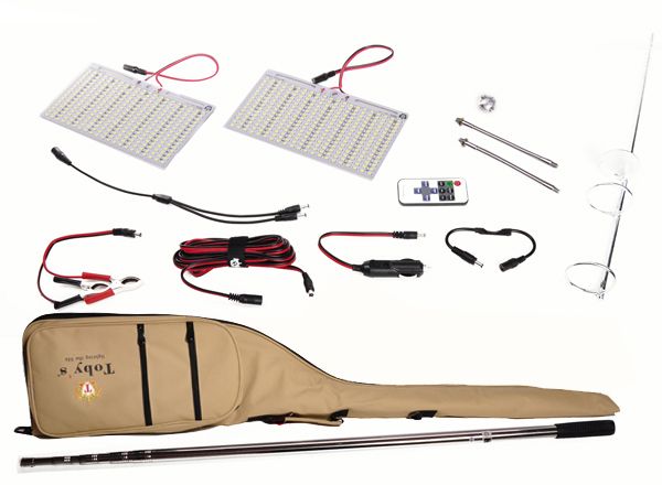 Toby's 12V Camp light Picnic light barbecue light on Stainless steel Telescopic rod, 2 LED light panel 380watts with remote control. It can be connected to directly to the car battery , car cigarette outlet , 12V power bank (jump starter battery ) or any other 12V power sourcePackage includes:2 LED light panel 380 watts .5 meter Stainless steel Telescopic rod , collapsible and extendable.Stand.Multi lightning options Remote Control.Long power Cable.Lighter adapter and car battery clamps.carrying bag for storage.