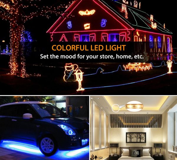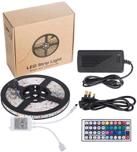 All in one kit: Comes with flexible LED strip light, 44 key remote controller, 12V/5A power supply, IR control box and connectors. No more accessories are required. Easy installation: Strong self-adhesive tape holds strip light safely and securely without damaging things by using screws. LED strip lights can be cut between every 3 leds without damaging the rest strips. The adapter can load 2 strip of 5050 LED lights. But do not overload the light strip. Strip width is 10mm. Safe to use: The working voltage is 12V, low power consumption and extremely low heat. It is touchable and safe to children. Wide application: The strip is IP65 waterproof. Multi-colored options include white with dimming and brightness controls are suitable for indoor outdoor lighting and décor. Such as kitchen, under cabinet, bedroom, patio, TV Backlighting, automobile, mirror, balcony, party, wedding, Christmas decoration, etc. Customer Satisfaction Guarantee: At Toplus, we guarantee the quality of all products by offering 12-month warranty, free replacement or a full refund. No questions asked, no hassle. Product Specifications: - Color: RGB LED type: 5050 SMD LED LED quantity: 300 LEDs /5 Meters - Size: 500cm (L) x 1.0cm (W) x 0.3cm (H) - Working Input Voltage: DC 12V Output power: 60W /5 Meters - Protection rating: IP65(Splash and water resistant, NOT for submersion) - Viewing angle: 120º - Lifespan: over 50,000hrs - Storage Temperature: -40ºC~+80ºC - Operating Temperature: -25ºC~+60ºC 44Key Remote Controller - Type: 44Key Remote Controller - Connection mode: Common Anode (+) - Input/Output: 12V - Max load current: 2A each color - Output: Three CMOS drain-open output - Color: 20 Colors 8 Light Pattern: Quick / Slow / Auto / Flash / 7 color fade change / 3 color fade change / 7 color jumpy change / 3 color jumpy change /R / G / B increase and decrease control Wide Application Widely used as decorative or guidance lighting for homes, under cabinet, gardens, stores, yachts, bars, automobiles, party, cinemas, theaters, etc. Package Contents 1 x 16.4ft/5m 5050 RGB Led Strip Light 1 x IR Control Box 1 x 44 Key Remote Controller 1 x 12V/5A Power Supply
