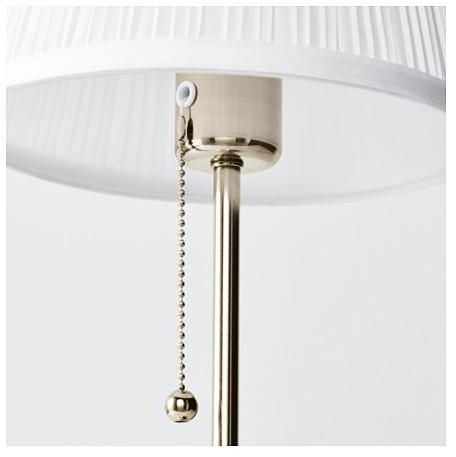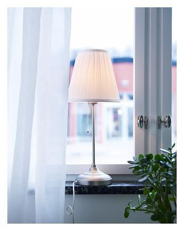 The textile shade provides a diffused and decorative light.