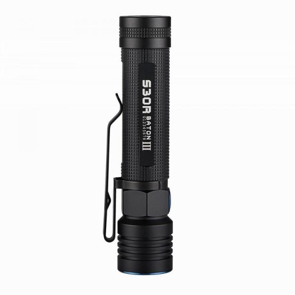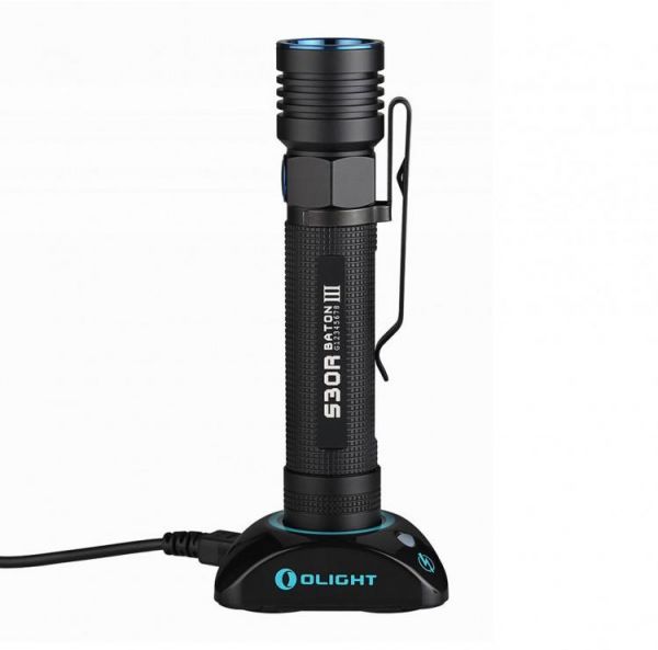 The S30R Baton III (S30R III in short) is the third generation of our flagship S30R flashlight series. This flashlight includes our signature Olight blue accents with the latest Cree XM-L2 LED that covers an output range from 0.5~1,050 lumens. The S30R III is equipped with our Olight branded high performance 3500mAh 18650 rechargeable battery and USB desktop charger with suction cups on the bottom for improved stability on any surface. The S30R III is also compatible with the portable USB magnetic charging cable as an optional charging accessory (MCC) which can work with power banks for charging on the go. The high output, portability, convenient charging, and long runtime can meet all your illumination needs for home, travel, and the great outdoors. FEATURES:One customized 3500mAh 18650 battery included providing a maximum output up to 1050 lumensUtilizes a smooth aluminum reflector which provides an improved beam focus for medium and close-range illumination paired with a hardened glass lens that is coated allowing for a 99% light transmission rateThe S30R III is shorter by 3mm in length, reaching 114mm than the previous S30RIIMagnetic tail cap that allows it to be secured to ferrous metal surfaces for hands free workNew USB desktop charging dock provided. This flashlight also has a charging port that is compatible with Olight magnetic charging cables which can be used for charging on the goLow power and Lockout indicator under the side switch. When the battery voltage is running low (below 3.1V) or when the flashlight is locked out and being clicked, it will glow redThermal management program to protect the users’ hand and flashlight from heat. The 1050 lumen turbo mode will stay on for two minutes before stepping down to the 500 lumen high mode within one minute.Direct access to turbo mode: when the flashlight is off and not under lockout mode, double click to activate the turbo modeTimer function: long timer (9 minutes) and short timer (3 minutes)INCLUDED ACCESSORIES:Flashlight (with stainless steel clip) •Customized 3500mAh 3.6V 18650 battery (included in the flashlight)Lanyard with Perforating Tool4.2V 1000mAh Desktop Charging Dock50cm Micro-USB CableInstruction Manual