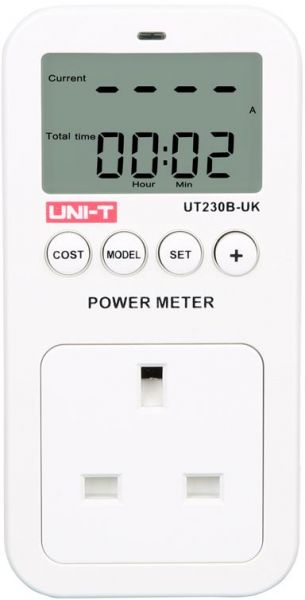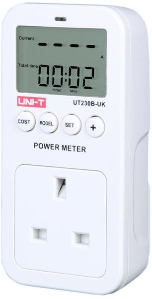 UT230B series products are multiple function intelligent power meters. User could takeit as power meter, electricity meter, voltage meter, current meter, energymeter. Areaof Application: Household, Factory, School, apartment, and so on. Specifications Range Best Accuracy Model UT230B-UK Voltage 100.0V~260.0V ±1% Current 0A~16.00A ±1% Frequency 45Hz~ 65Hz √ Power 0~3680W ±1% Power factor 0~1.00 ±2% Energy consumption 0~9999KWh ±1% Feature Unit Price of Electricity 0.00~99.99($/kWh) √ Cumulative Time 0 minute~9999Days √ Cumulative Charge 0~9999$ √ CO2 Display 0~9999kg √ Product Power Consumption <0.4W √ Overload indication >16A √