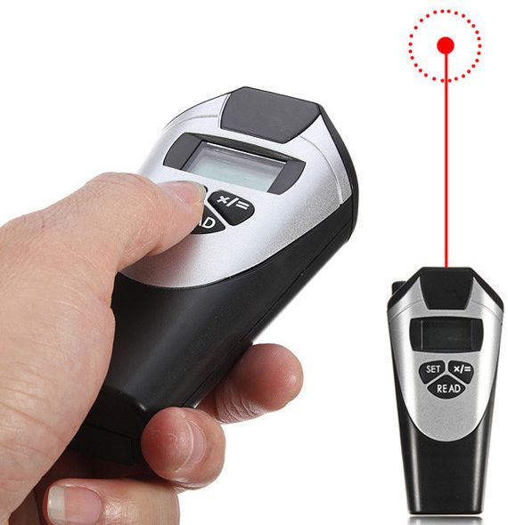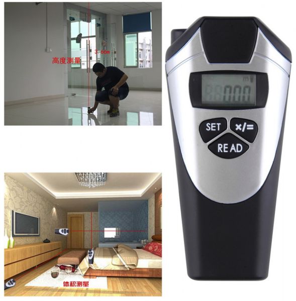 描述:The ultrasonic distance measuring meter allows you to measure, store, and calculate distances. Press READ to turn on the device. This distance meter allows you to store 3 different measurements. This function is useful if you want to measure the length, the width and the height of a room. The device will initially display the units in meters, but also can be displayed in feet. The distance meter turns itself off if no key is pressed within about 30 seconds. Features - Measure Range: 2 to 60 ft (0.50 to 18.288m)- Unit of measurement: Feet or Meters- Accuracy: 0.5%1 digit(2-60ft)- Working Frequency: 40kHz- Working temperature: 32F to 109.4F (0C - 43 dgree C)- Power: 1 x 9V Battery (battery not included)- Standalone upright or Horizontal- Dimensions: 123 x 60 x 40mm (L x W x T)- Color: Mainly Black