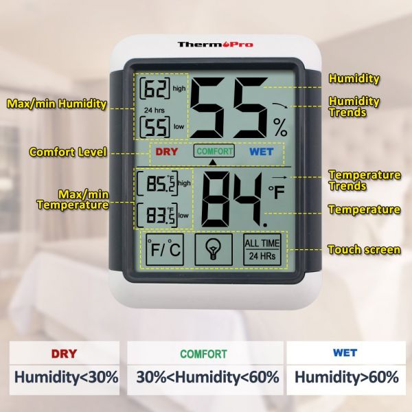 【Responsive, Accurate Readings】Indoor hygrometer thermometer measures humidity and temperature gauge to provide updated and accurate readings with every 10s; Humidity level icons indicate current air conditions -- DRY/COMFORT/WET; Humidity meter ensures proper humidity control, which is the benefit for skin, allergen and other health problem