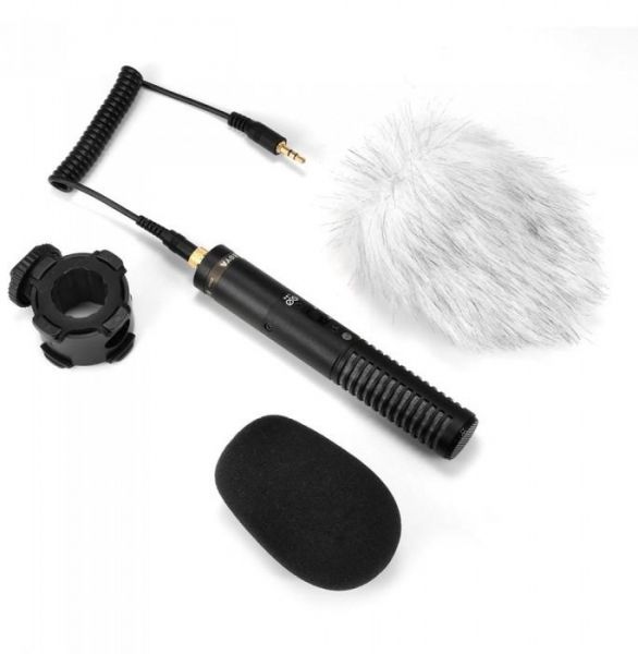 Stereo X/Y condenser microphone Compact, lightweight and easy-use Designed for DSLR cameras, Camcorders, Audio recorders etc Professional condenser circuitry ensures excellent sound quality Locked cable with 3.5mm stereo mini plug Powered by included LR44 battery Integrated cold-shoe mount and foam windshield ON/OFF switch for convenient operation Also includes fur windscreen, battery, and pouch Specifications: Polar Pattern: X/Y Stereo Frequency Response: 60Hz - 18kHz±3dB Sensitivity: -30dB +/- 1dB / 0dB=1V/Pa, 1kHz Impedance: 2000 ohms Maximum SPL: 120dB, 1KHz Signal to Noise ratio: 78dB Dynamic Range: 95dB, 1 KHz Battery Type: 1.5V LR44 Battery Current: 6.5 mA