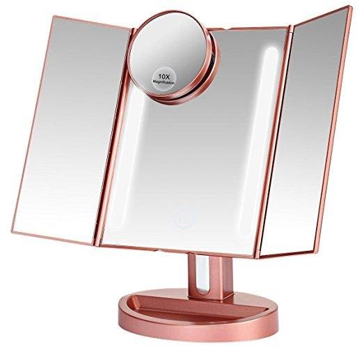 Lighted Makeup Mirror with 10X/3X/2X/1X Magnification, Trifold Vanity Mirror with 22 LED Lights, 180 Degree Free Rotation & Touch Screen Control, Dual Power Supply Travel Countertop Cosmetic Mirror