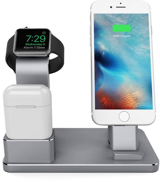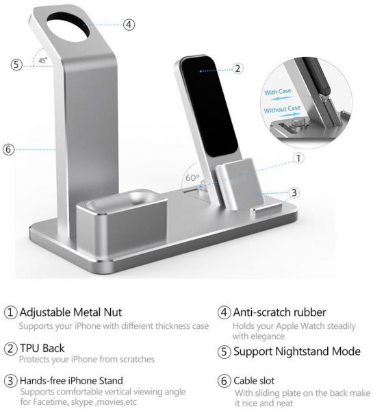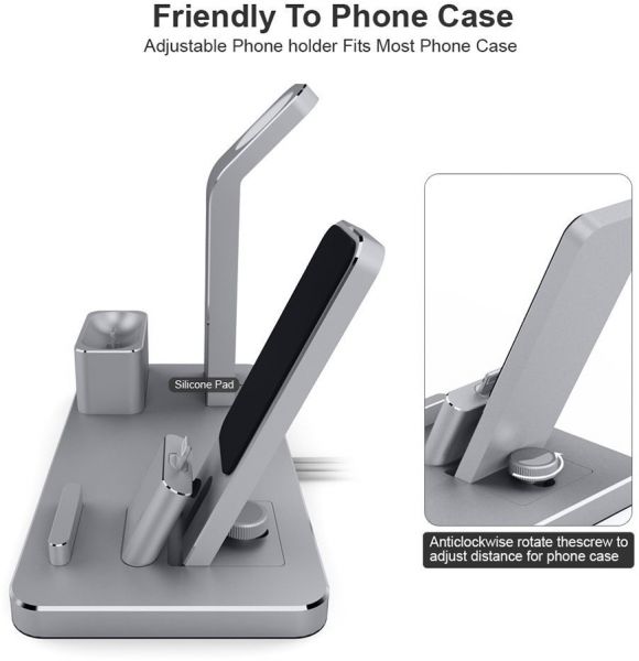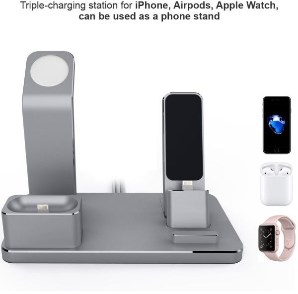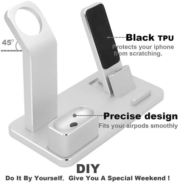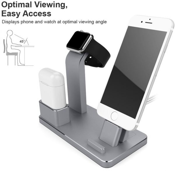 【4 in 1 ALUMINIUM CHARGING STAND FOR APPLE WATCH 4 and series】Works as an iWatch Stand, AirPods Stand, iPhone Holder and iPad 7.9, steadily holds your Apple Watch. 45° angel supports Nightstand Mode. Specially designed as an Airpods Accessories, avoids your Airpods missing. Vertical iPhone charging station allows viewing angle for facetime. ATTN: Apple Watch magnetic charging cable or iphone cable are NOT INCLUDED.