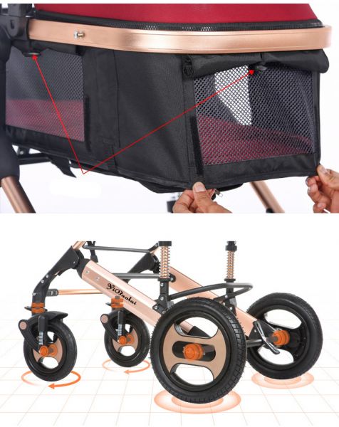 1. Fine steel Frame. Fully adjustable handlebar and weather protection cover. Large cushioned cradle. High view. Two-way stroller. Quickly fold. Super shock absorbers. Safe and comfort. Large storage basket. Rotate the front wheel with the suspension spring. Fully adjustable 5 point harness.