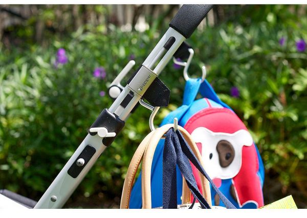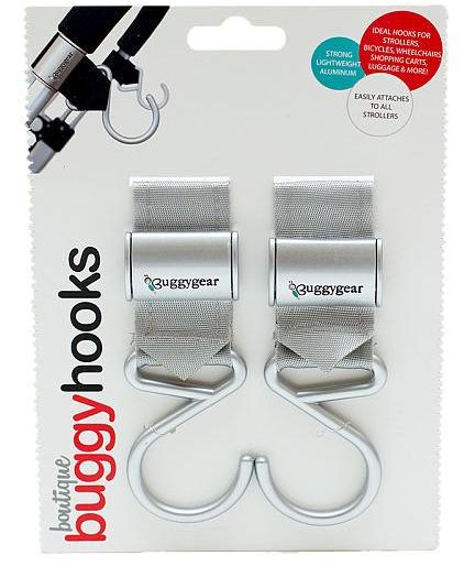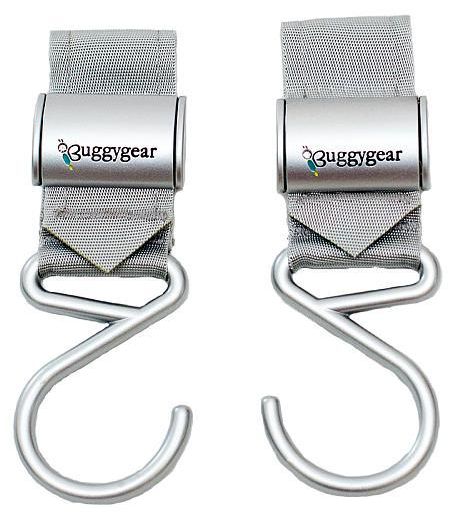 Buggygear Premium Boutique Buggy Hooks (Set of 2) - Silver/Platinum. First and only premium stroller hooks with no Velcro or plastic. This pair of handy buggy hooks hook to each side of your stroller to hang individual items or one large stroller bag. The high end metal clasp with the interwoven strong fibers latched securely to most crossbars. Rubber strap grips holds hook from sliding around.