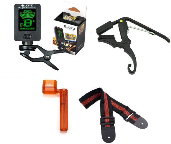 Guitar players most wanted essential accessries pack includingJoyo mini chromatic guitar tuner, bass tunerGuitar Capo / ClampAlice string winder with knob removerAdjustable guitar strap