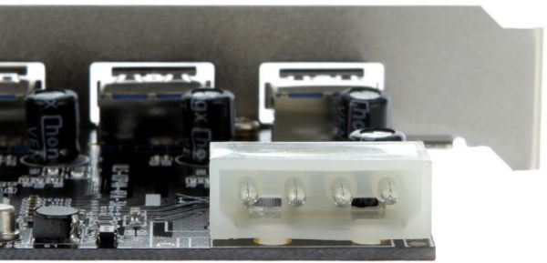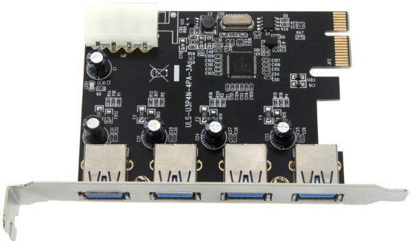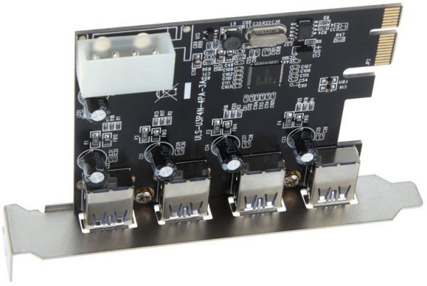 Features: Chipset ID: NEC uPD720201. Supports PCI Express2.0 X1 Lane, can transferring up to 5Gbps MAX. Supports USB 3.0 specification typeA Connector X 4ports. Backward compatible with USB 1.1/USB 2.0. Supports the following speed data rate: Low-speed(1.5Mbps)/Full-speed(12Mbps)/High-speed(480Mbps)/Super-speed(5Gbps). Supports External power plug in order to supplying power for each USB3.0. Up to 900mA MAX/port.