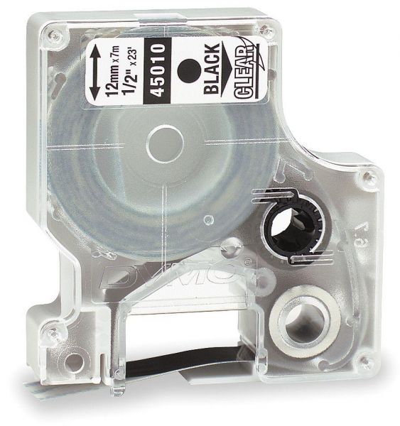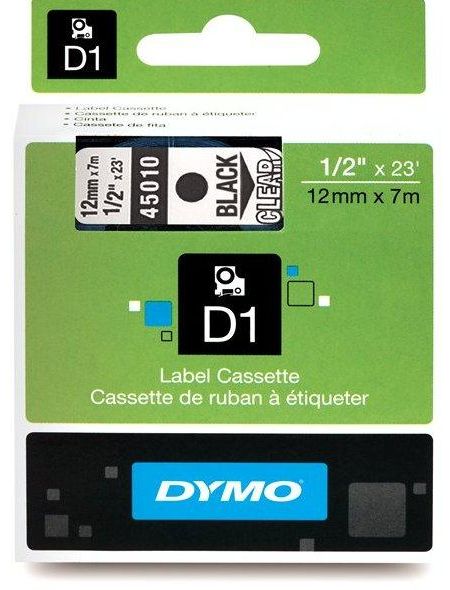 DYMO D1 Labeling Tape - 12mm x 7m - Black on ClearCreated specifically for your LabelManager and LabelWriter Duo label makers, DYMO D1 labels offer the performance and variety you need for most labeling jobs. They adhere to most clean, flat surfaces – including plastic, paper, metal, wood and glass – and feature easy-peel backing for trouble-free application. Versatile, durable and available in a wide variety of widths and colors, D1 labels take the hassle out of home and office organization.“Easy Peel” for trouble-free applicationThermal transfer printing technology – no ink or toner requiredRemove labels without leaving adhesive residueAdheres to most clean, flat surfaces including plastic, paper, metal, wood and glass