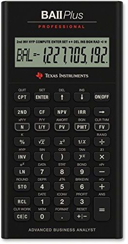 The BA II Plus Professional calculator features all the great features of its predecessor while packing in even more time-saving functions to make short work of complex equations. It's an ideal choice for entry level and advanced finance, accounting, economics, investment, statistics, and other business classes. It's also a great choice to bring to the Chartered Financial Analyst (CFA) exam. Along with the standard capabilities of time-value-of-money, accrued interest, amortization, cost-sell-margin, and depreciation calculations, users can calculate more advanced business and finance related issues. It will handle net future value (NFV), modified internal rate of return (MIRR), modified duration, payback, discount payback, and more. Its rugged metal exterior, firm-touch keypad and anti-slip rubber feet make it ideal for anyone in accounting, economics, investing, statistics, and related businesses.