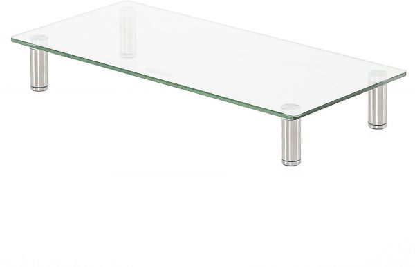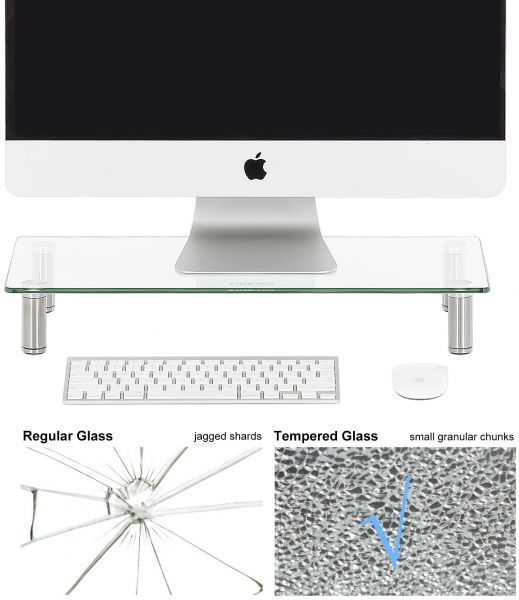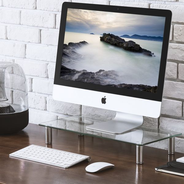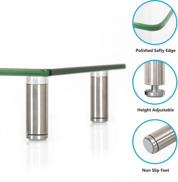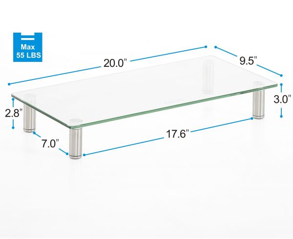 Support for laptops, computer, PC, IMAC, tv screens, printers, fax machines, keyboards and mouseApproximate Dimension: W 50.8 x D 24 x H 7.6 cm, Max load capacity:25kgsMade of 6mm clear tempered glass and high-strength metal tubeThe leg can be adjusted height 0-12mm, Raises monitor to comfortable viewing heightCreating underneath space to store keyboard, smart phone, sticky notes or personal stuffs