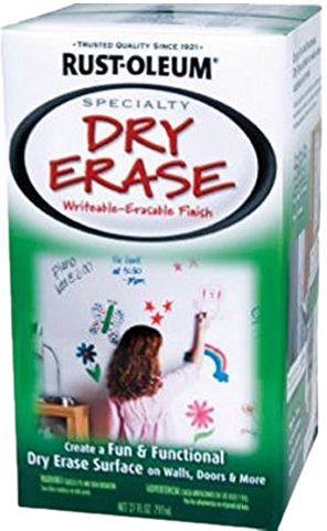 Rust-oleum dry erase paint kit is a smooth, hard finish that creates a unique white writeable-erasable surface. 27 ounces of glossy white finish. Once thoroughly dry for 3 days, simply use any dry erase markers to draw or write messages and then erase. Application is easy and it has minimal odor making it safe to use indoors. Ideal for use on interior surfaces such as drywall, Masonite, wood, cement, metal. For indoor use only. Great for offices, playrooms, kids rooms and more. Part a and part b mixes easily and is ready to paint immediately. For best results apply to a very smooth surface and allow to dry 3 days before applying dry erase markings.