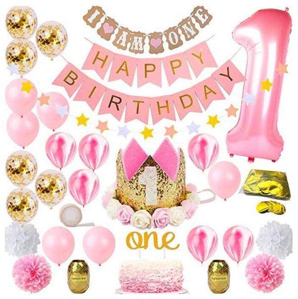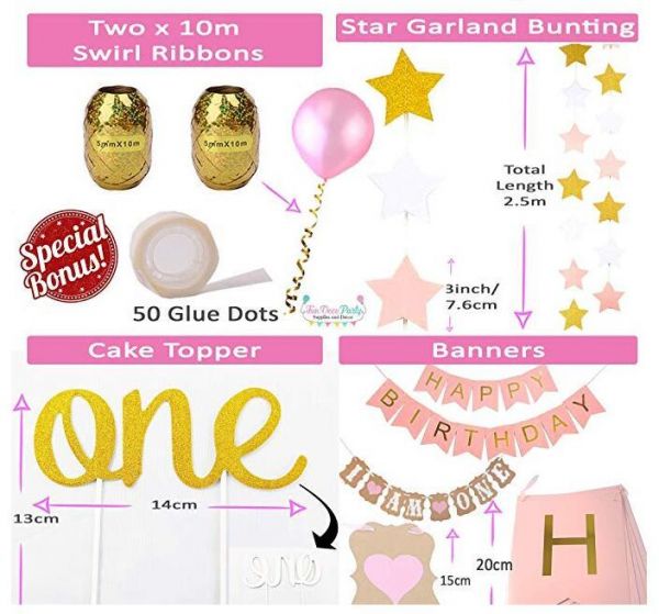 BARGAIN PROMOTIONAL PRICE + HIGH QUALITY: No compromise on quality. You won't find rips or holes in our balloons (unlike most other bundles out there). The card paper banners are absolutely top class (and spelled correctly!!!), the glittery ONE Cake Topper, Bunting and Pom Pom flowers are all set to glamorize your memorable pictures. The pink and golden crown tiara party hat is super cute as well.