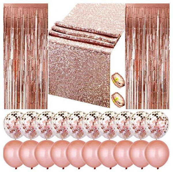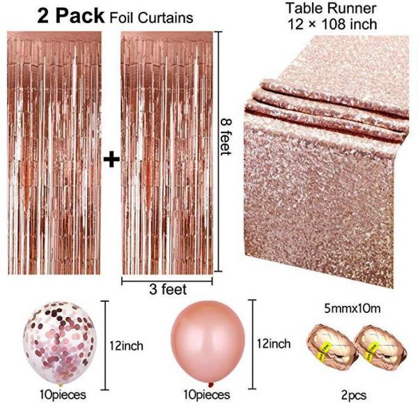 Package contents: 1 x sequin table runner, 2 x foil fringe curtains, 10 x confetti balloons, 10 x latex balloons, 2 x foil ribbon, the rose gold color will bring you dreamy feeling