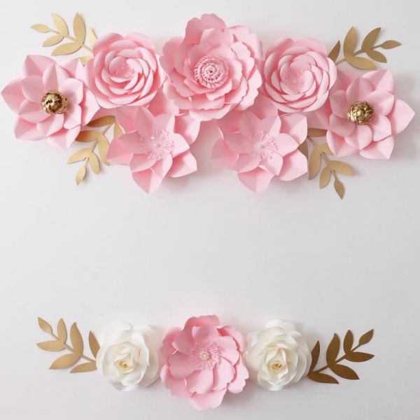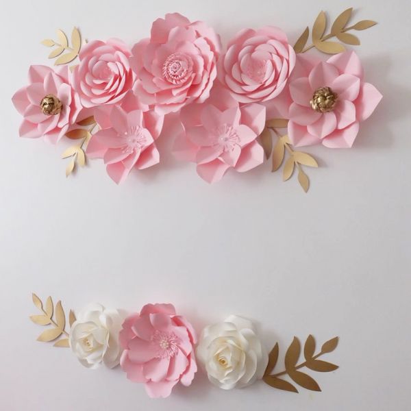 PINK WHITE GIANT PAPER FLOWERS WITH GOLD LEAVES 11PCS