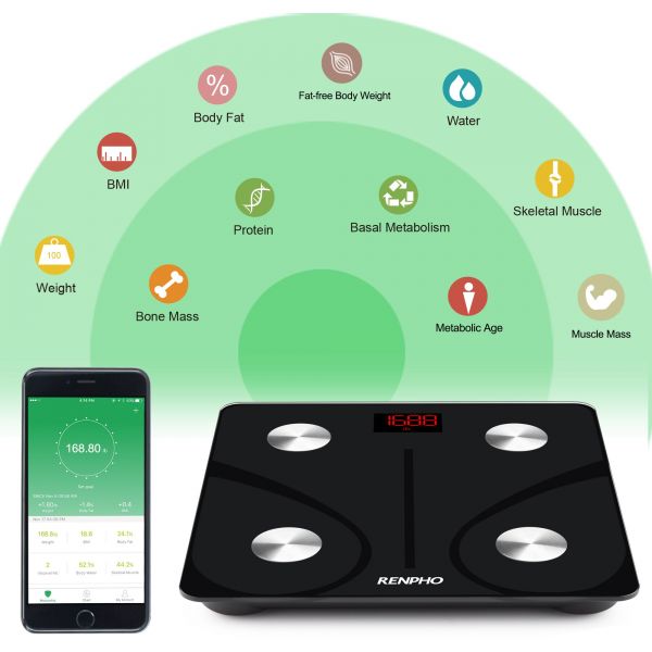 6.Please stand on the scale with DRY & BARE feet and make sure your feet are touch 4 electrode areas on the surface of the scale before use when taking body fat and other data. And please also noted that you need to turn on the Bluetooth on your Phone and make a connection with the Bluetooth Scale via App (names RENPHO).