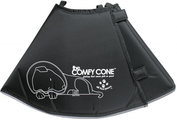 The Comfy Cone is a soft, cone-shaped e-collar that helps your pets recover from surgeries, procedures, allergies and hot spots in comfort. At All Four Paws, we've designed The Comfy Cone with innovative and practical features that will help your pet recover and heal post-procedure or during allergy flare-ups. All Comfy Cones are made with foam-backed, padded nylon that is easy to clean and is water-resistant and repellent. The tight gauge of the nylon even prevents cats from getting their claws into the material! The Comfy Cone uses Velcro for tight closures, making it easy to get the cone on and off animals quickly. And the cone can be reversed inside and out, as well as front to back to support shoulder and upper back injuries.