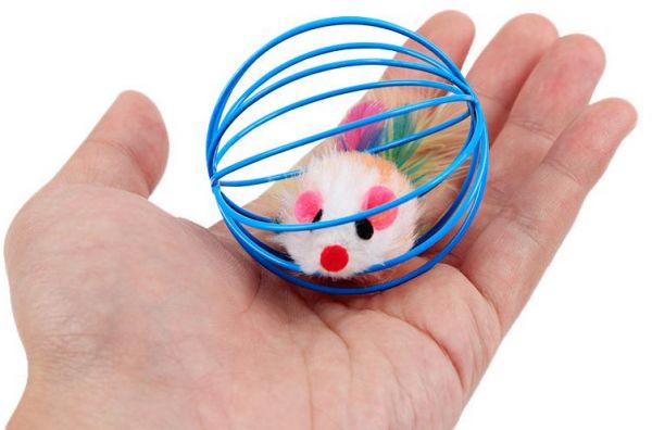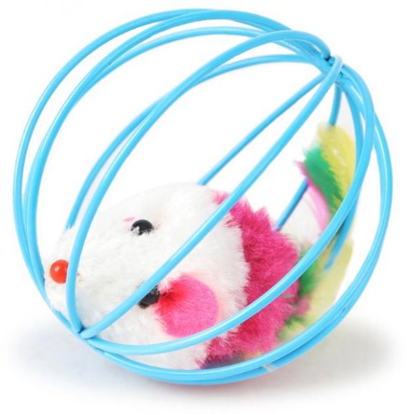 Color Pet Cat Playing Toy Teal Fake Mouse Mice Rat in Cage Ball-blue