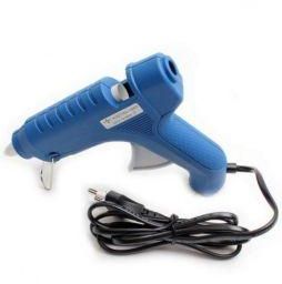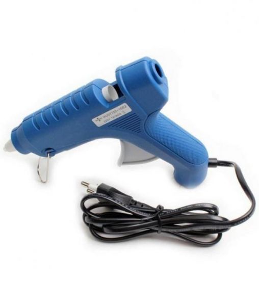 Glue Gun G-250 Hot melt adhesive (HMA), also known as hot glue, is a form of thermoplastic adhesive that is commonly supplied in solid cylindrical sticks of various diameters, designed to be melted in an electric hot glue gun. The gun uses a continuous-duty heating element to melt the plastic glue, which may be pushed through the gun by a mechanical trigger mechanism, or directly by the user. The glue squeezed out of the heated nozzle is initially hot enough to burn and blister skin. The glue is tacky when hot, and solidifies in a few seconds to one minute.