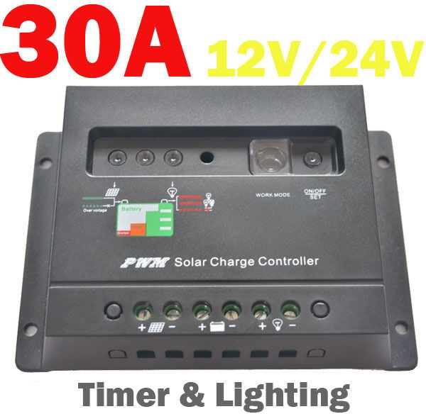 描述:- -PWM 30A Solar Charge Controller Panel Regulator 12V 24V - The Solar lighting Controller for solar system with automatic lighting control and time functions. - The Solar Controller is designed with a microcontroller for automatic lighting control functions. - Proven reliability - Precise lighting controller - PWM battery charging - Microcontroller digital accuracy - Fully automatic operation - 16 field adjustable lighting control options - Manual test capability - Detects day and night using the PV array - Suitable for all 12V /24V lamps - Suitable for Seal lead acid battery - Temperature compensation - Voltage: 12V/24V Auto Switch - Charge current: 30A - Load current: 30A - 25% current overload: 1 min. - Load disconnect: 11.1V or 22.2V (depending on 12V or 24V voltage) - Load reconnect: 12.6V or 25.20V (depending on 12V or 24V voltage) - Equalization voltage (10 mins): 14.6V or 29.2V (depending on 12V or 24V voltage) - Boost voltage (10 mins): 14.4V or 28.2V (depending on 12V or 24V voltage) - Float voltage: 13.6V or 27.2V (depending on 12V or 24V voltage) - Temperature compensation (mV/C): -30mV or -60mV (depending on 12V or 24V voltage) - Operating temperature: -35 ~ 55C - Maximum support 720Watt (24V) 360Watt (12V) - Dimension: 142mm (L) x 34mm (H) x 96mm (W) - Digital LED display shows the 16 lighting options (by switch with 5 seconds) - Number display, from 0 to 7, DC output. - Number display, from 0. to 7. 1Hz output. - Digital LED stop flash to confirm correct switch selection. - 10 minutes delay to make sure its real dark.