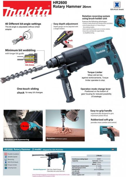 - Easy-to grip handle ergonomically designed to give maximum power thrust.- 2 operation modes - hammering with rotation and rotation only.- Less bit wobbling.- One-touch sliding chuck for easy bit change.- Operation mode change lever positioned on the bottom of gear housing for reduced possibility of breakage.- Double Insulation, Variable Speed, Reversing, SDS Plus, Torque Limiter and Carry Case. Tool sold without bit.Specifications Continuous rating input800WCapacityConcrete: 26mm Steel:13mm Wood:32mmImpacts per minute0 - 4,600No load speed (r/min)0 - 1,200r/minDimensions (L x W x H)361 x 77 x 209mmNet weight / Power supply cord2.8kg / 2.5m