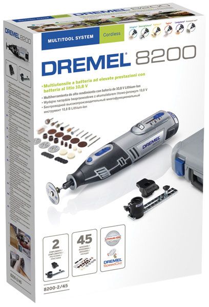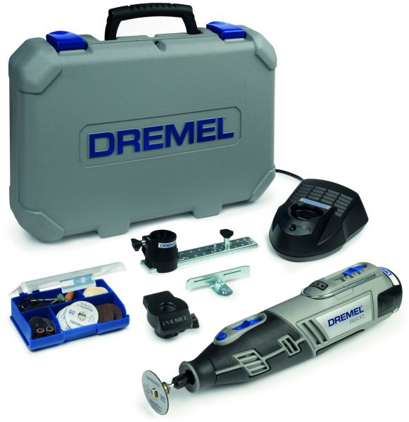 描述:- This Dremel kit is the premium offer in the cordless multitool range. The high performance 8200 Li-ion cordless multitool with EZ Twist nose cap, comes in a practical carrying case which contains a 1-hour battery charger, the Shaping Platform attachment, allowing you to sand or grind perfectly at 90° and 45°, the Line & Circle Cutter attachment and 45 original Dremel accessories including EZ SpeedClic. With this supreme kit even the most demanding craftsman will be satisfied.