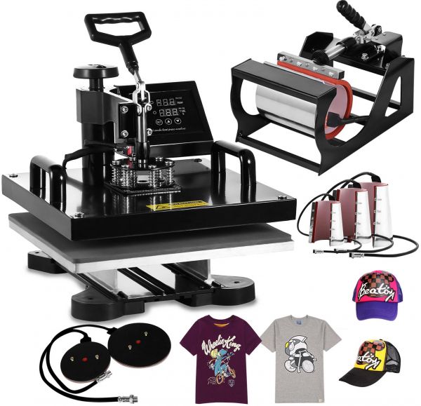 This 8 in 1 heat press machine can be used for T-shirts, caps, ceramic plates, ceramic tiles, mugs, coasters, mouse pads, jigsaw puzzles, lettering, other misc. fabrics & materials. It can transfer colorful pictures and characters of sublimating and dissolved printing ink onto ceramics, glasses and textiles such as cotton, flax, chemical fiber, nylon, etc. This all-in-one press includes flat platen, mugs and plates. The swing-away heat press boasts all of the must-have attachments.