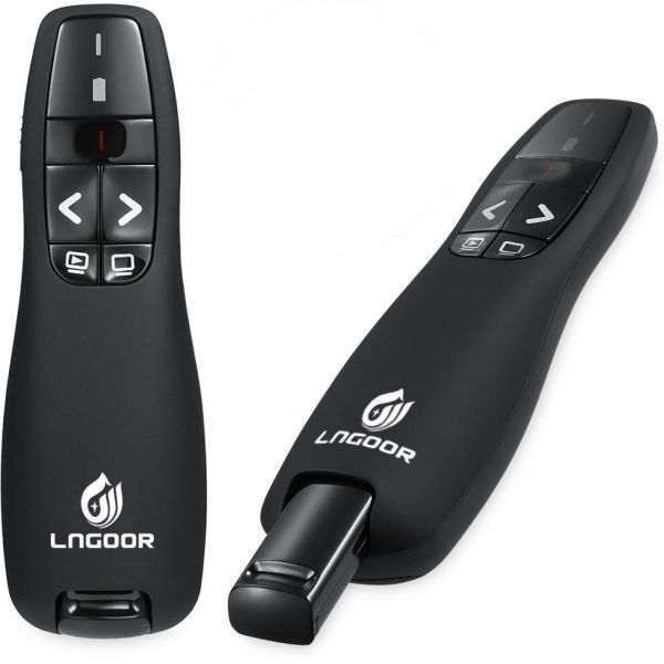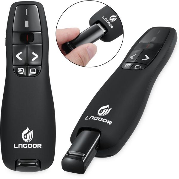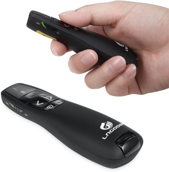 LNKOO Wireless Presenter, RF 2.4GHz Power point PPT Clicker Presentation Slides Remote Control Laser Pointer Flip Pen FEATURES: Battery Not Included; Equipped with top-grade microchip, up to 100 meters wireless range. It is made of nickel plating metal dome and silicone keypad, brings you comfortable touch feeling Comes with auto standby and deep sleep functions for energy-saving and durable use, equip with a separate switch that effectively avoids unwanted power consumption when you put it in your bag. A red laser pointer that's easy to see against most backgrounds, highlight key areas of your slides, super easy to use to take your eyes of your audience. Support hyperlink with Tab/Alt+Tab/Enter function, It also combines Page Up, Page Down, Full Screen, Black Screen, Volume Up/Down for PowerPoint Presentation. The mini USB receiver supports plug and play technology. No driver is required. Built-in docking bay stores USB receiver for easy pack up and portability, and ONE USB receiver can be controlled by SIX transmitters simultaneously.Support options: Supports MS Word, Excel, PowerPoint, ACD See, website, iWork (Keynote & Numbers & Pages),Google Slides, Prezi, etc; Supported OS: Win2000,XP,Vista,Win7,Win8,Win10,MAC OS, Linux