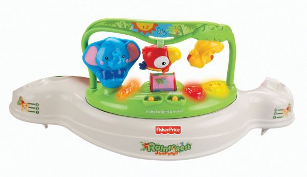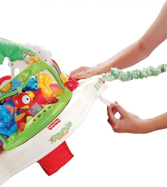 Everything your baby needs can be found in this Rainforest Jumperoo. Its newly designed frame allows you to opens it up from the top, and lets the seat rotate 360 degrees so baby can play and interact from any side. A fun seat and toys at five locations on the platform engage baby all the way around, and an electronic toy at the front has motion, music and lights that can be activated by baby spinning a drum. Seat also features a bobbling elephant, a monkey swinging from a vine, a parrot hanging from a bead bar, a clear spinning bead ball, a tiger that plays hide and seek, a spinning lizard that makes rattling sounds, a tethered chew toy and a stack of chips with cute graphics for baby to explore. Two soft leaves extend from the frame to create an overhead 'canopy' with soft toys that dangle down for fun bat-at play. Jumperoo has three height adjustments for extended use. Frame pivots to a nested position so it can be tucked away when not in use. Includes a motion sensor that encourages kids by rewarding them with lights and sounds when they jump. It also features a rotating seat with soft spring covers that keep little fingers safe from pinching, and three-position height adjustment for a custom fit. And no doorway is required to use this toy, making it a breeze to set it up anywhere.