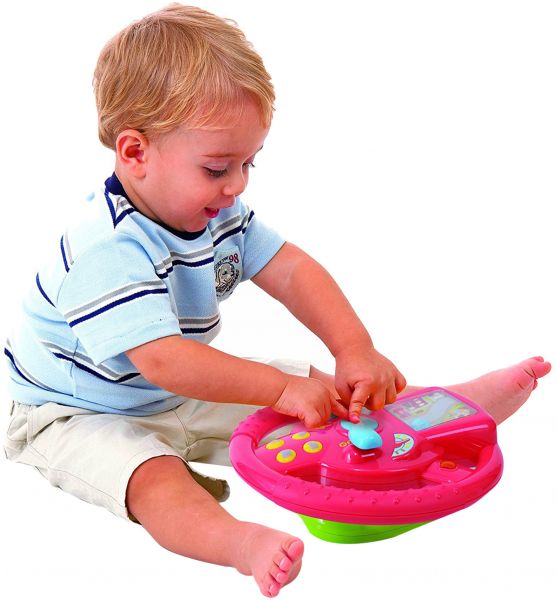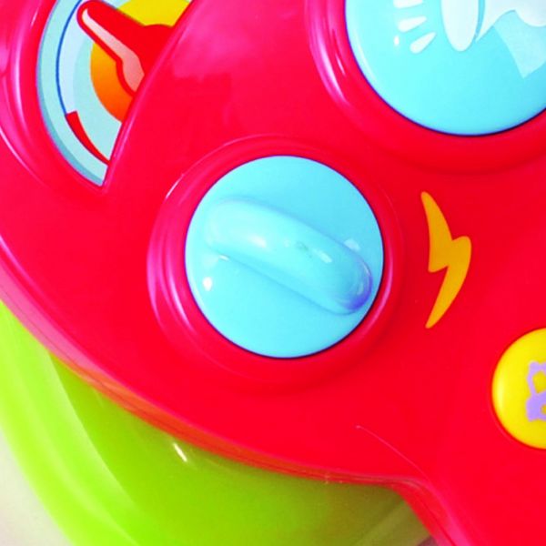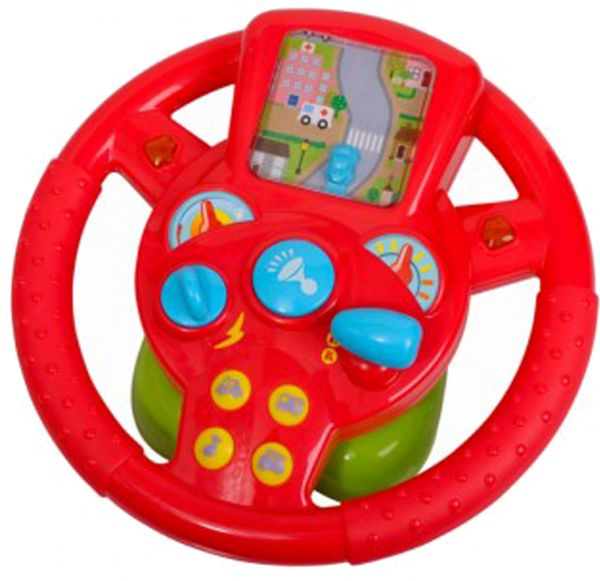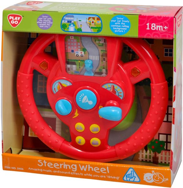 Drive' your car with the steering wheel and travel around the mini city. 'Drive' your car freely with the continue rolling background picture! Brightly colored steering wheel with interesting city scenery. Amazing music and sound effects while you are driving! Battery: AA x 3 pieces (included). Suitable for ages 18 months +