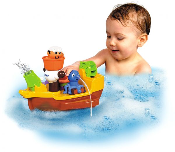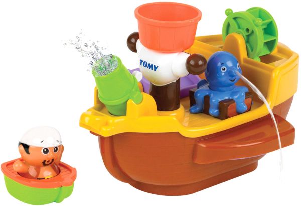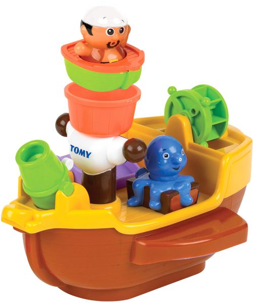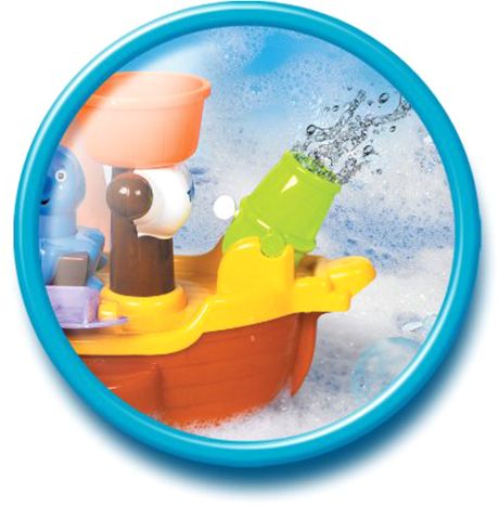 Sail the high seas and have lots of bath time fun with Pirate Jake aboard the Pirate Ship. Pirate Jake can climb the mast for a bird's-eye view over the bubbles. His playful octopus is ready to give a quick squirt to any unwelcome visits. For a more masterly blast of water Pirate Jake merely needs to activate his big red cannon at the helm of the ship. Uh-oh, enemy gaining ground. Quick, add more water to the big spinning wheel for extra power. And if all else fails for our loveable Pirate, he can also climb into the getaway dingy and launch himself into that wet and bubbly ocean.