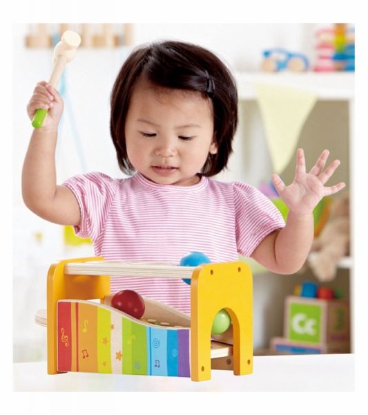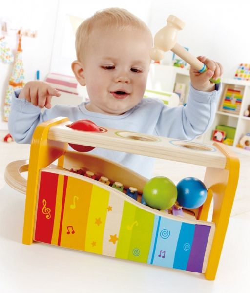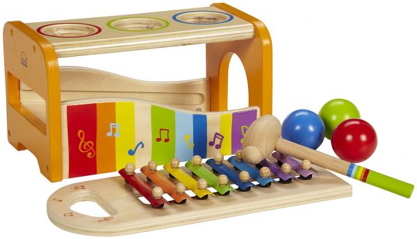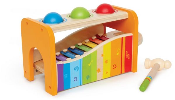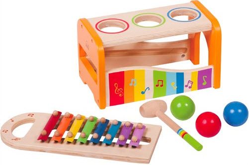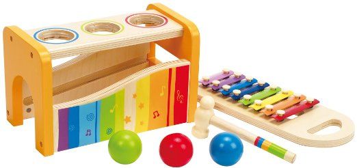 Hape Early Melodies Pound and Tap Bench puts toddler toys in one fun place. Kids can tap balls through the holes of the wooden ball drop bench. Or, they can pound down the xylophone for a fancy tune. Let the young maestro strike a note.