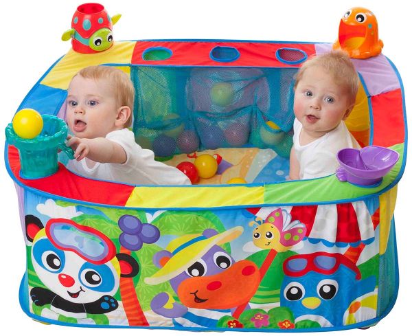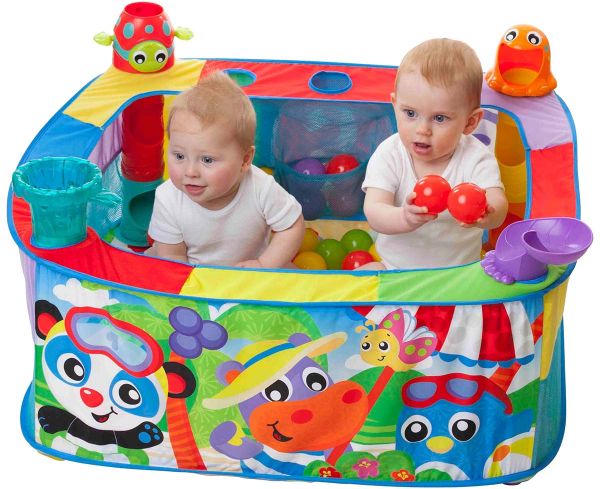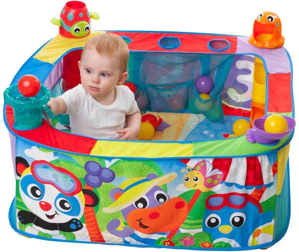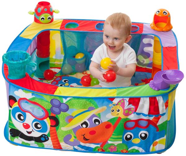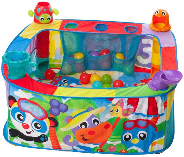 This colorful ball gym has 4 different ball activity stations where baby can pop, drop or slide the balls in, out or down and around! There will be hours of fun in this large ball gym with 30 colored balls that easily store within 3 pockets. With a beach inspired theme, the colored and vibrant characters and patterns on the gym will assist in visual development and cognitive imagination.