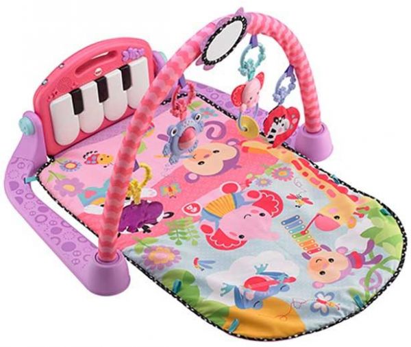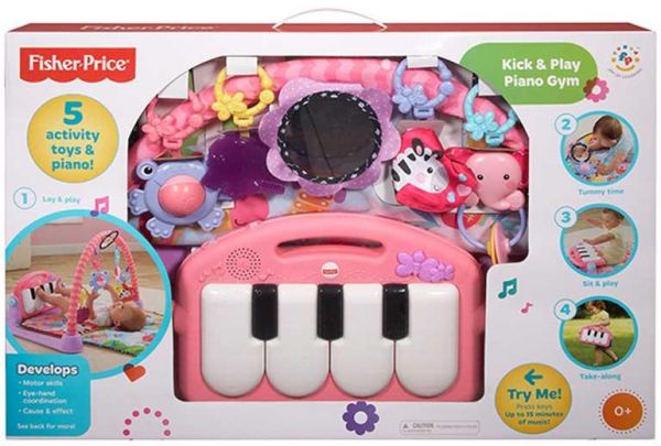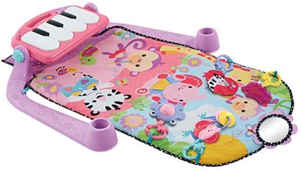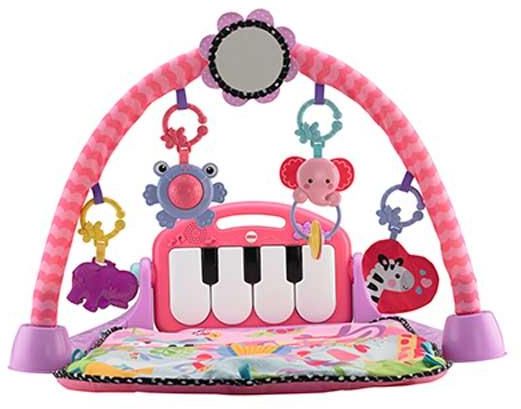 Baby kicks. Music plays. And that's just the beginning of this sweetly styled, oh so pink gym. Movable toys on the overhead gym encourage baby to bat and grasp. Move the arch down for tummy time play, or let baby sit and entertain you with a piano concert. And now with a removable piano, you can take the musical fun wherever you and baby go.