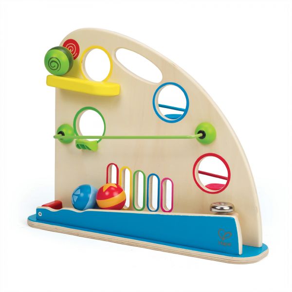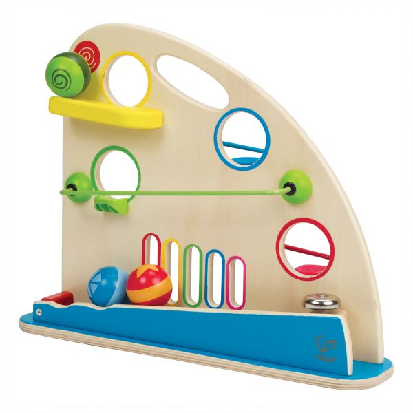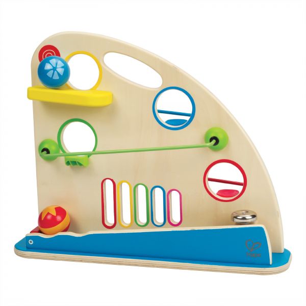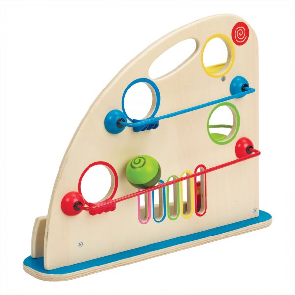 Colorful wooden balls, peek-a-boo holes and fast tracks create a 2-sided mountain of fun.