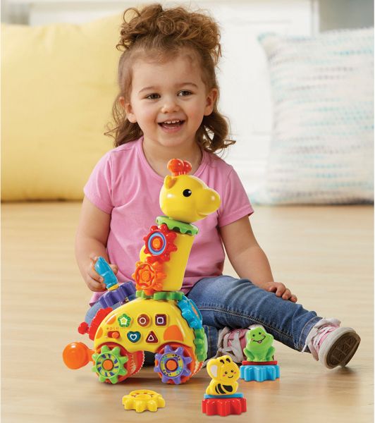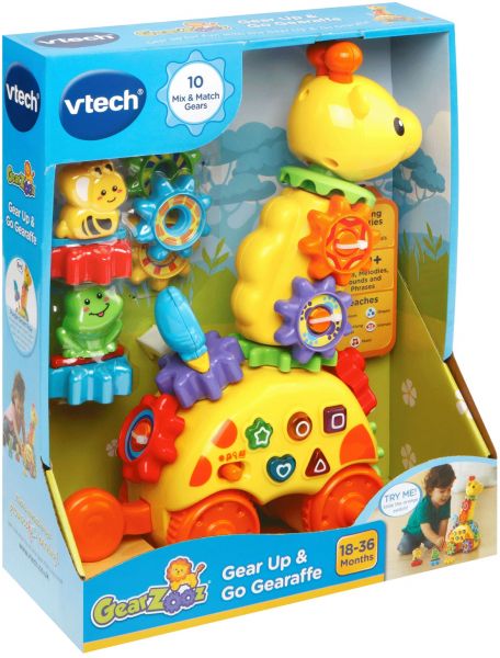 Gear fun play set with push along giraffe activating a happy sung song and gear movement. Create a gear giraffe with animal friends horizontally, vertically, or both, using the gears, bases and connector pieces. 3 animal gears teach animal name and sounds with fun responses. Includes 10 gears that can be mixed and matched. 5 press shape buttons introduce shapes, numbers and encourage exploring in the fun quiz mode.