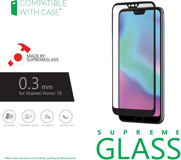 AmazingThing Supreme Glass Full Glue Tempered Glass Screen Protector for the Huawei Honor 10 is only 0.3mm thick but features a high level of 9H Hardness rating to Protect your screen. It features Full Adhesive on the glass protector instead of only borders to ensure a proper fit and prevent dust from entering. Supreme Glass also features curved rounded edges for a safe, comfortable and precise fit. The Oleophobic coating prevents fingerprints and contaminants making the glass protector easy to clean. Touch Screen sensitivity is maintained like the original screen. The Black Borders assist to align the protector while installing for a perfect fit and original look of the screen. The Protector is purposely manufactured a bit smaller than the original screen size making it a Case Friendly Glass Protector allowing you to install most covers without any problem. (If using a case / cover - recommended to install protector with the case on and make sure your case is NOT touching / Pushing up the screen Protector edges.)