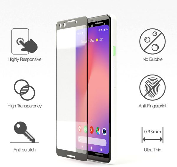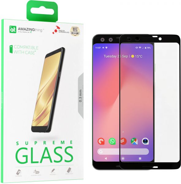 AMAZINGthing Tempered Supreme Glass Screen Protector for the Google Pixel 3 is only 0.3mm thick but features a high level of 9H Hardness rating to Protect your screen. The protector covers almost the entire screen with a color matched border to replicate the original look of the phone bezel. Supreme Glass also features curved rounded edges for a safe, comfortable and precise fit. The Oleophobic coating prevents fingerprints and contaminants making the glass protector easy to clean. Touch Screen sensitivity is maintained like the original screen. The Protector is purposely manufactured a bit smaller than the original screen size making it a Case Friendly Glass Protector allowing you to install most covers without any problem